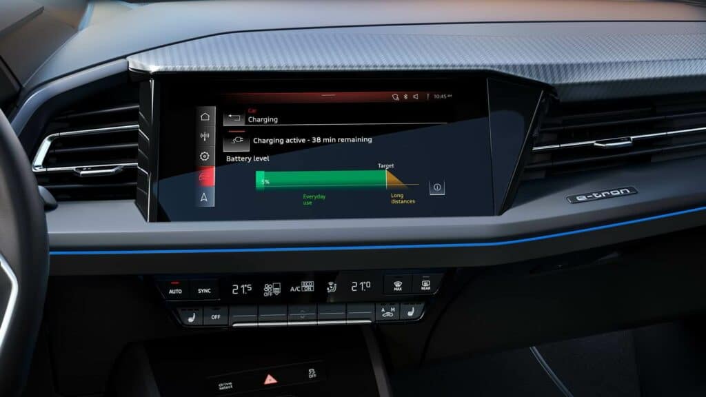 L’efficienza dell’Audi Q4 Sportback e-tron si manifesta anche durante la ricarica, con un valore massimo fino a 125 kW.
